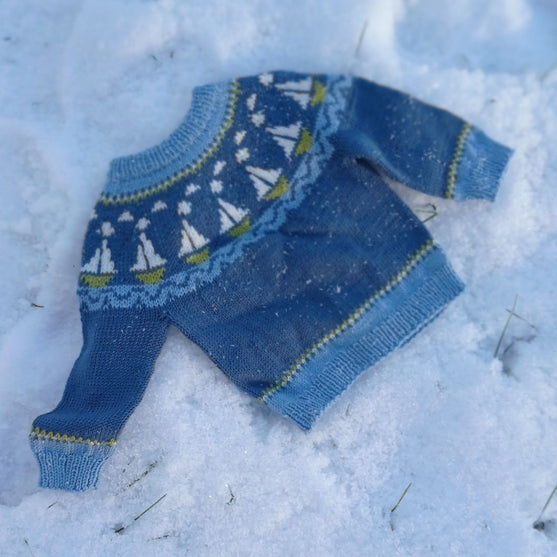 De trui wordt topdown gebreid. De halsboord is gebreid met een extra elastische opzet-techniek, zodat de trui gemakkelijk over het hoofd gaat. De boorden worden afgekant met Italiaans afkanten.
